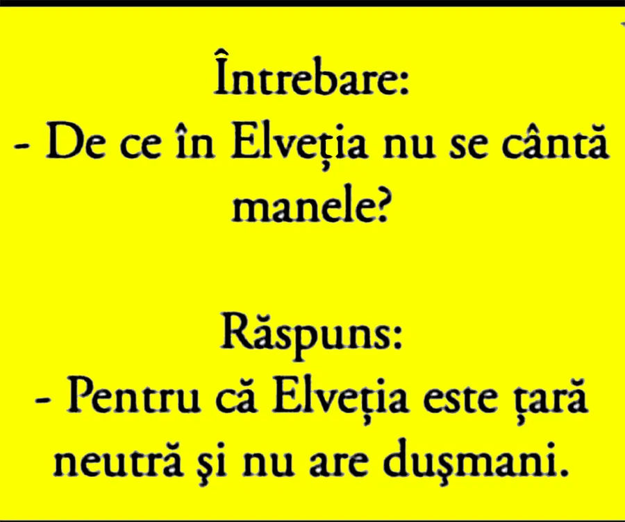 Dragă cititorule, ia o pauză de la ce faci și citește următorul banc pregătit de CANCAN.RO. Fie că ai avut o zi grea sau fie că lucrurile au mers ca unse, nu strică să râzi copios. Gluma de astăzi este despre un subiect destul de controversat: ascultatul manelelor. Întrebarea este simplă: De ce în Elveția nu se cântă manele? Răspunsul este cel care va stârni hohote de râs. Spor la citit și voie bună!