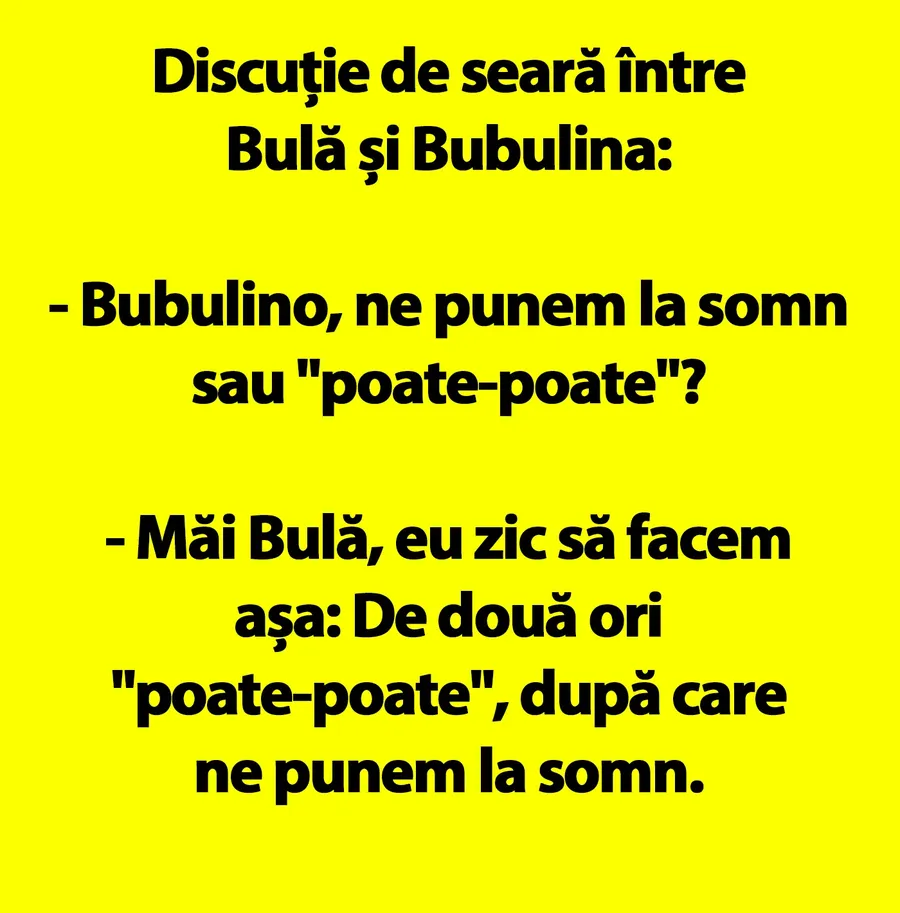 – Măi Bulă, eu zic să facem așa: De două ori „poate-poate”, după care ne punem la somn.
