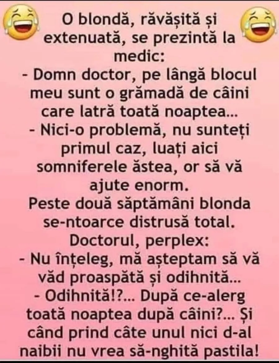 Dragi cititori, începeți ziua cu voie bună! CANCAN.RO a pregătit pentru voi o glumă savuroasă. Garantăm că veți râde cu lacrimi. Spor la citit și voie bună! Protagonista de azi este o blondă la doctor.