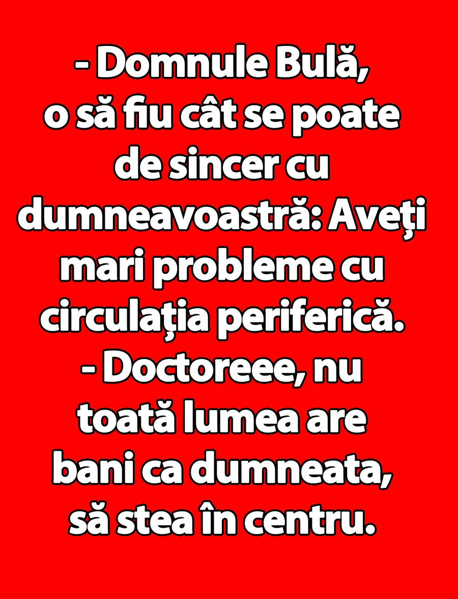 – Domnule Bulă, o să fiu cât se poate de sincer cu dumneavoastră: Aveți mari probleme cu circulația periferică.