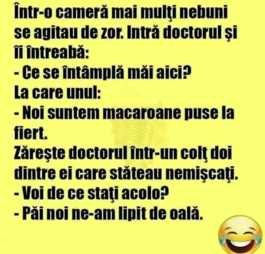 CANCAN.RO ți-a pregătit un banc de nota 10. Un doctor – dintr-un spital de nebuni – se confruntă cu o situație neașteptată. Ești pregătit să râzi cum nu ai mai făcut-o de mult timp? Spor și voie bună!