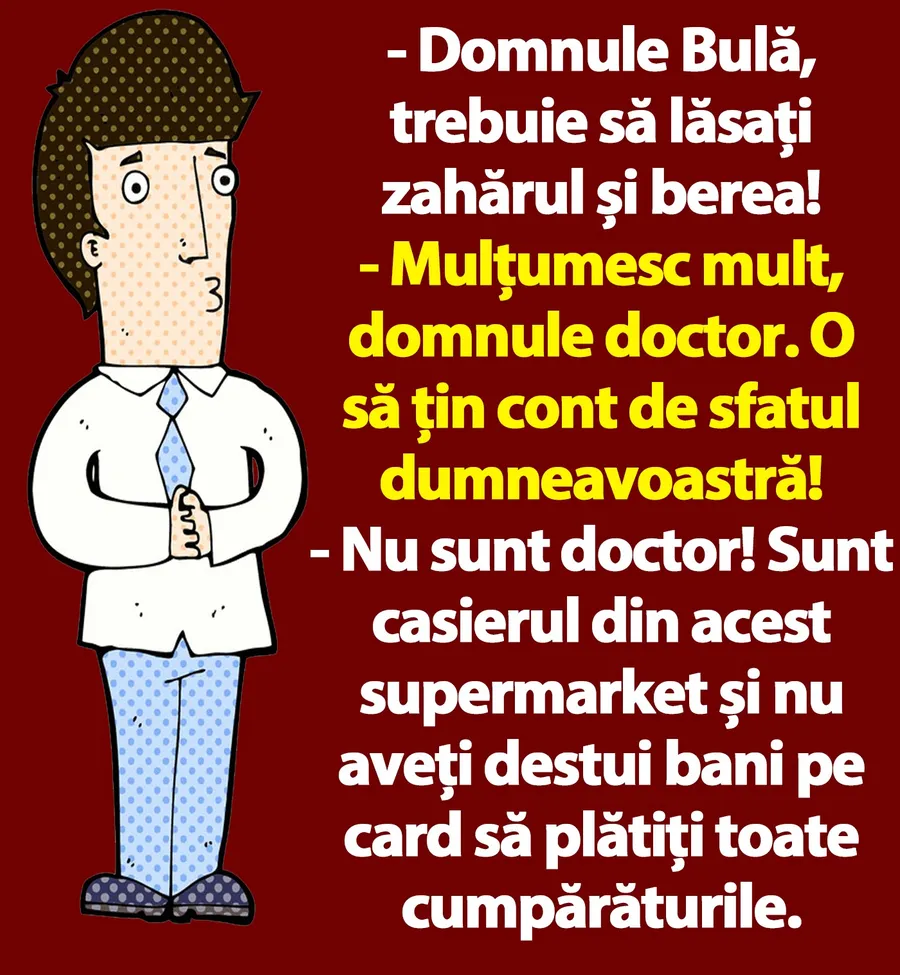 – Nu sunt doctor! Sunt casierul din acest supermarket și nu aveți destui bani pe card să plătiți toate cumpărăturile.”