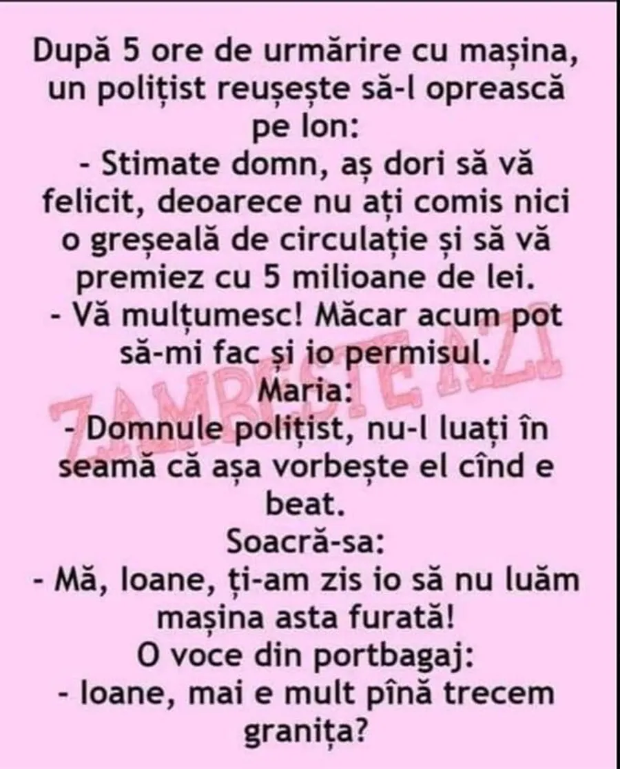 -Stimate domn, aș vrea să vă felicit, deoarece nu ați comis nicio greșeală de circulație și să vă premiez cu 5 milioane de lei.