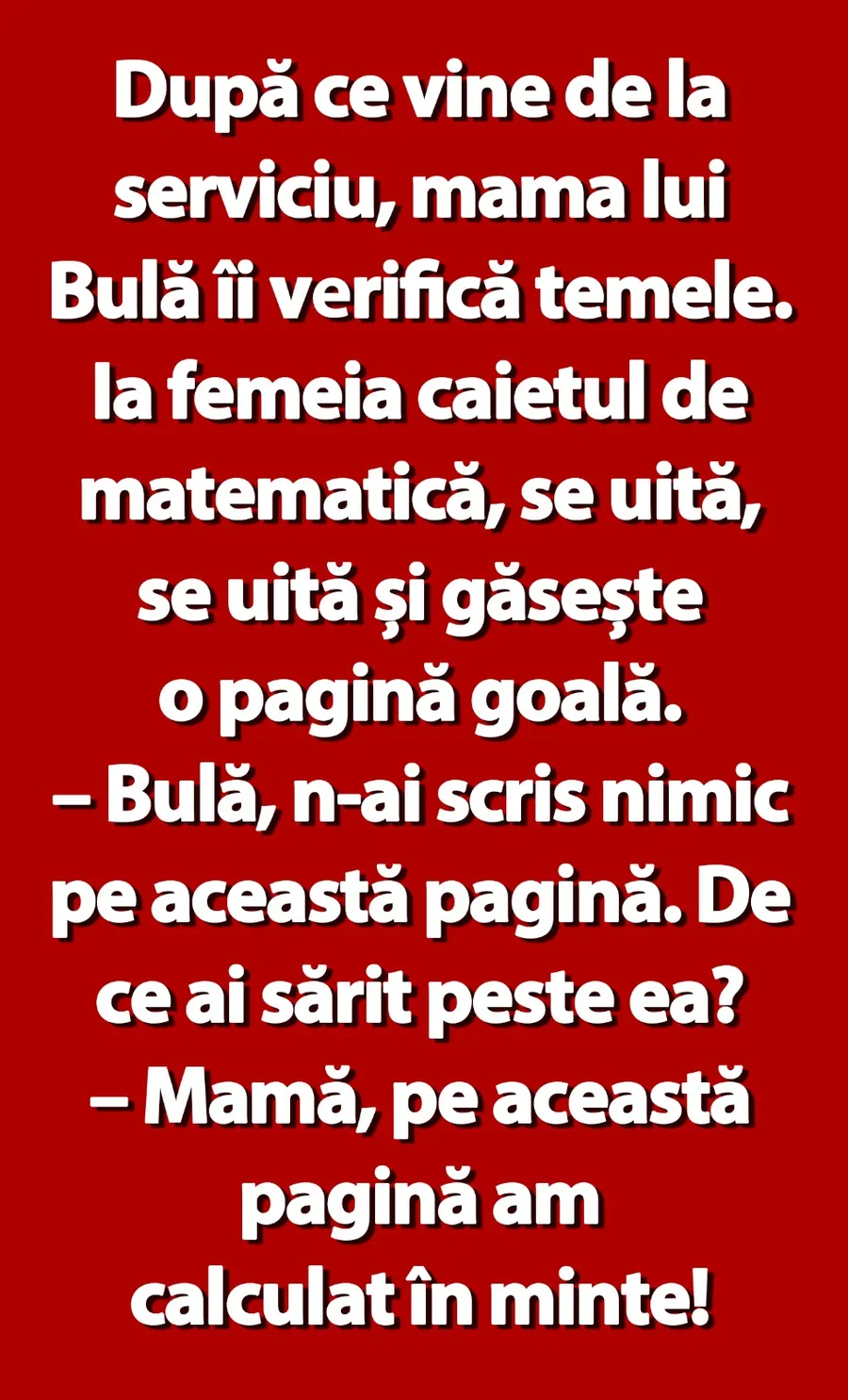După ce vine de la serviciu, mama lui Bulă îi verifică temele. Ia femeia caietul de matematică, se uită, se uită și găsește o pagină goală.