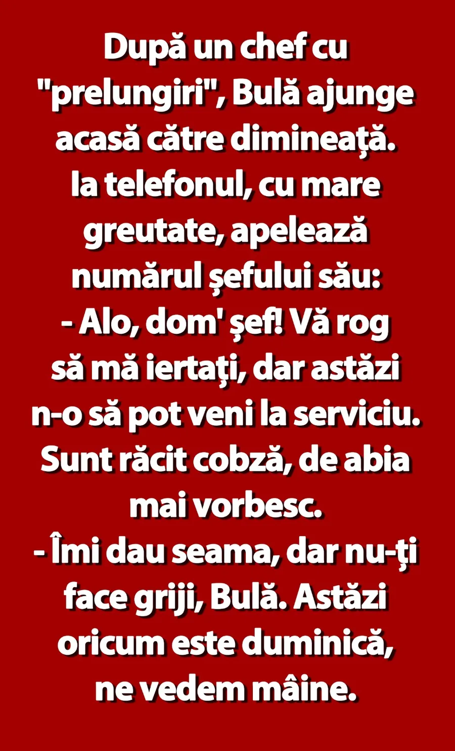 – Alo, dom’ șef! Vă rog să mă iertați, dar astăzi n-o să pot veni la serviciu. Sunt răcit cobză, de abia mai vorbesc.