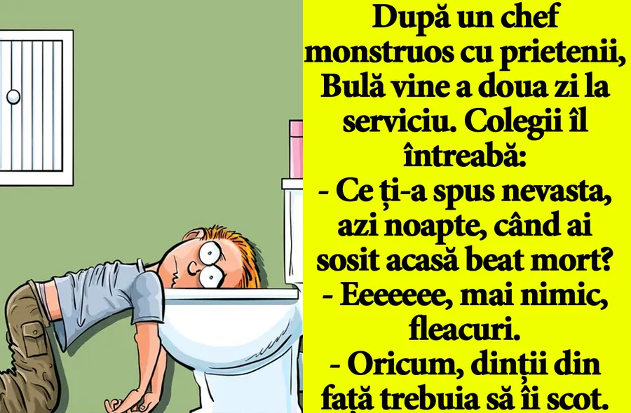 O zi bună e musai să înceapă și să se termine cu zâmbetul pe buze. Ți-am pregătit un banc de nota 10 care te va amuza copios. Bulă ajunge a doua zi la serviciu după un chef monstruos cu prietenii.