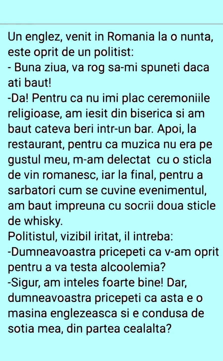 – Sigur, am înțeles foarte bine! Dar, dumneavoastră pricepeți că asta e o mașină englezească și e condusă de soția mea, din partea cealaltă?