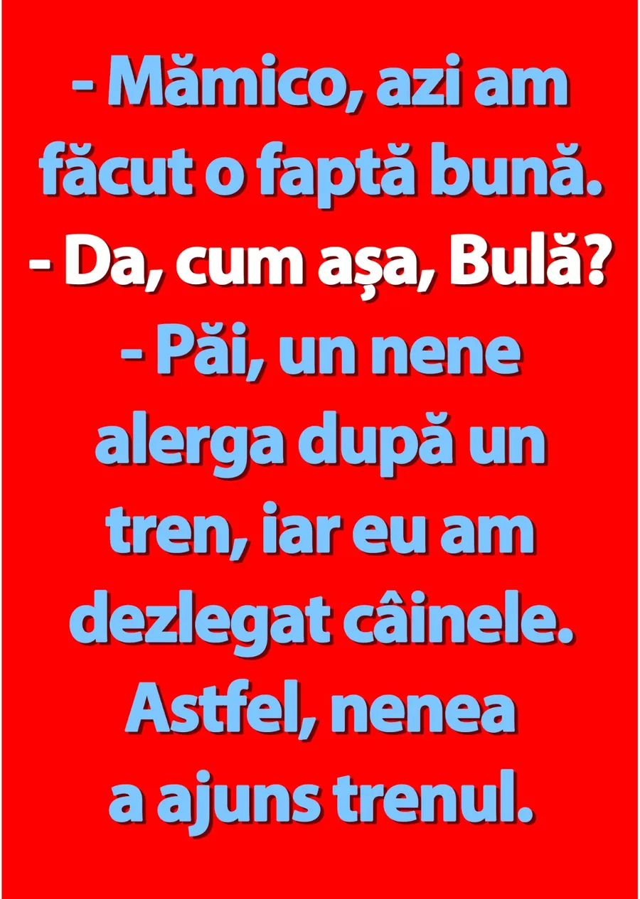– Păi, un nene alerga după un tren, iar eu am dezlegat câinele. Astfel, nenea a ajuns trenul.
