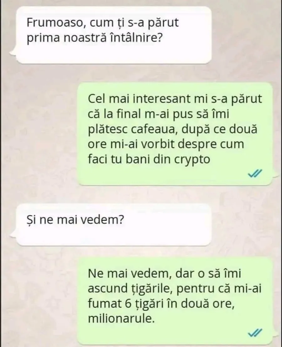– Cel mai interesant mi s-a părut că la final m-ai pus să-mi plătesc cafeaua, după ce două ore mi-ai vorbit despre cum faci tu bani din crypto.