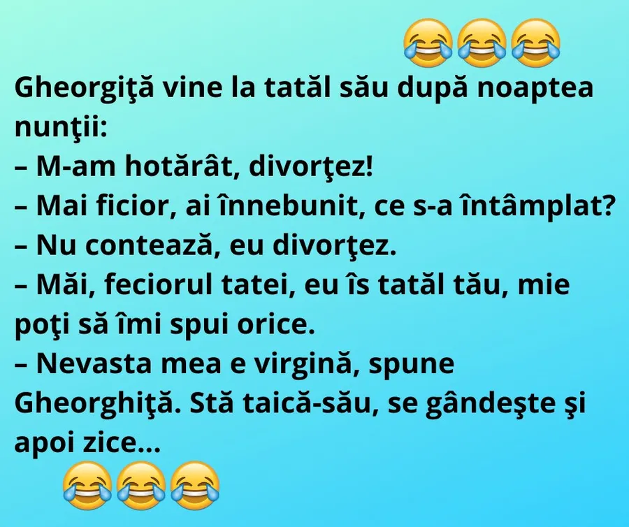 Chiar dacă este abia luni, noi dăm deja startul distracției. Redacția CANCAN.ro v-a pregătit un banc savuros, care va stârni amuzamentul! Protagonistul de astăzi este Gheorghiță, care se duce la tatăl său după noaptea nunții. Spor la distracție și la voie bună!