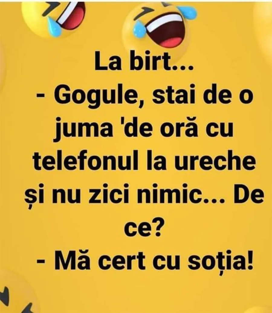 Este marți, suntem încă la început de săptămână, așa că avem nevoie de ceva care să aducă energie și voie bună. Pentru asta am pregătit un banc care cu siguranță o să te amuze copios. Protagonistul de astăzi este un bărbat care are o ceartă aprinsă cu soția. Deznodământul este hilar.