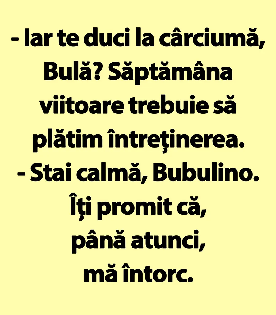 Ziua bună se cunoaște încă de dimineață, așa că trebuie începută cu zâmbetul pe buze. Iar pentru asta am pregătit un banc care cu siguranță te va amuza copios. Protagoniștii de astăzi sunt Bulă și Bubulina. El vrea să plece la cârciumă, iar ea este preocupată de lucruri ceva mai practice. Deznodământul este hilar.