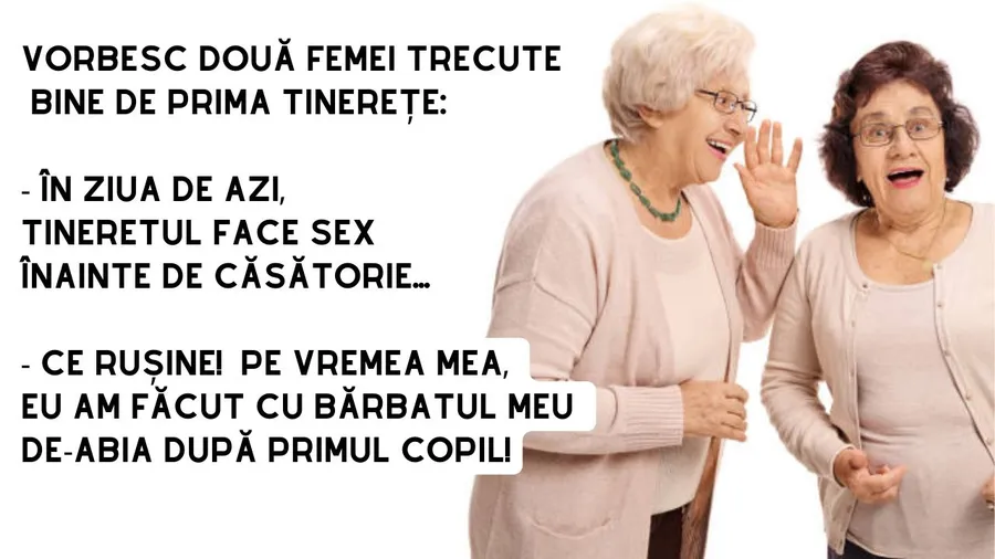 Ziua bună se cunoaște de dimineață, așa că trebuie începută cu zâmbetul pe buze. Am pregătit un banc, ce, cu siguranță, o să te amuze copios. Protagonistele de astăzi sunt două femei trecute de prima tinerețe. Acestea analizează relațiile tinerilor din ziua de astăzi. Deznodământul este hilar.