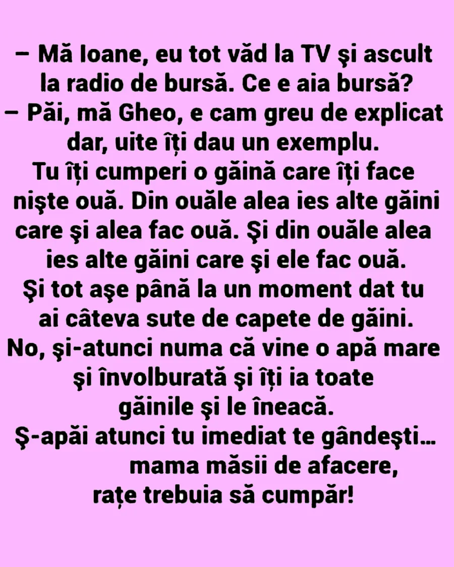 – Păi, mă Gheo, e cam greu de explicat, dar uite îți dau un exemplu. Tu îți cumperi o găină care îți face niște ouă. Din ouăle alea ies alte găini care și alea fac ouă. Și tot așa până când tu ai sute de capete de găini. No, și-atunci numa’ că vine o apă mare și învolburată și îți ia toate găinile și le îneacă. Și-apăi atunci tu imediat te gândești… mama mă-sii de afacere, rațe trebuia să cumpăr.