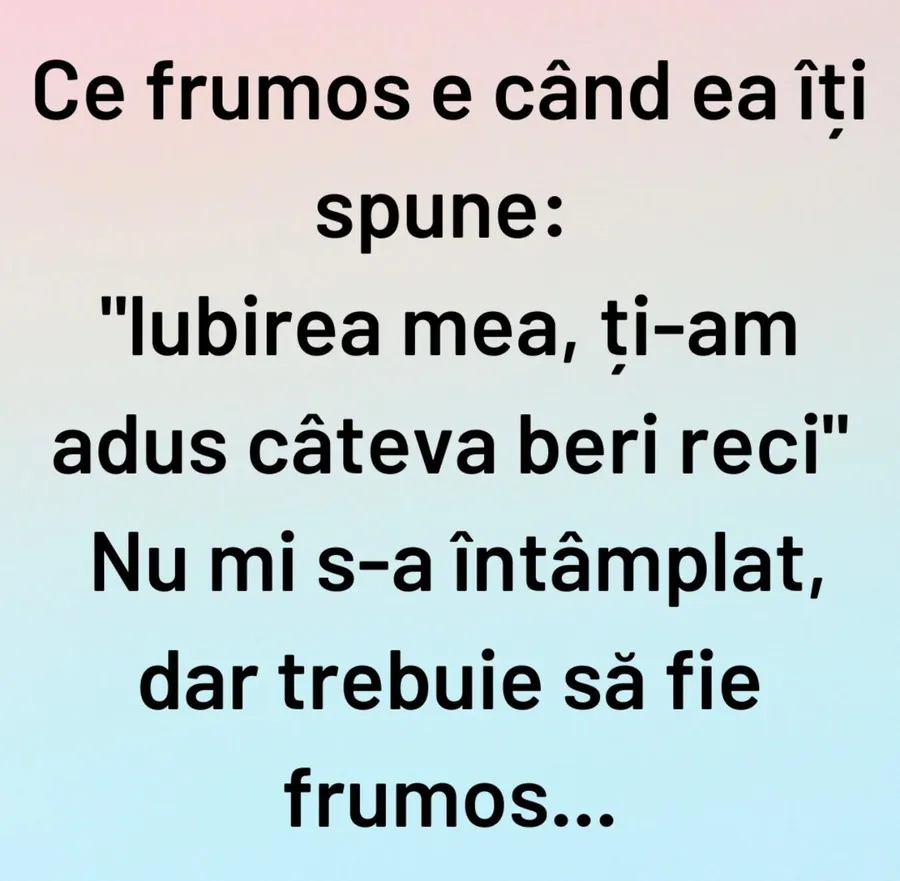 ”Ce frumos e când ea îți spune: ”Iubirea mea, ți-am adus câteva beri reci”. Nu mi s-a întâmplat, dar trebuie să fie frumos…”, este bancul zilei.