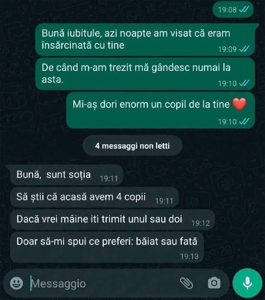 – Bună, sunt soția. Să știi că acasă avem patru copii. Dacă vrei, mâine îți trimit unul sau doi. Doar să-mi spui ce preferi: băiat sau fată.