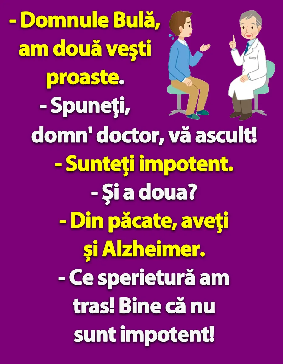 CANCAN.RO vrea să vă aducă zâmbetul pe buze în această dimineață, așa că vă pune la dispoziție un banc amuzant. Știm că glumele cu Bulă sunt printre preferatele voastre și ne-am gândit să vă prezentăm o conversație hilară între el și medicul său. Ce diagnostic grav i-a pus specialistul? Vei râde cu lacrimi atunci când vei vedea răspunsul lui Bulă.
