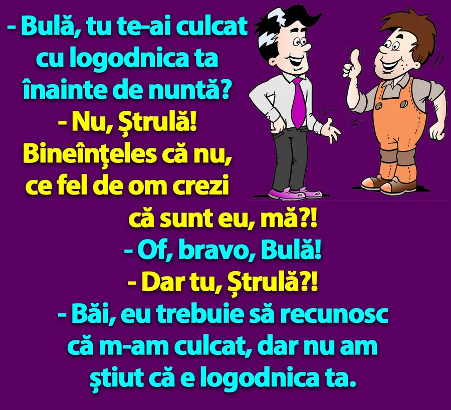 – Bulă, tu te-ai culcat cu logodnica ta înainte de nuntă?