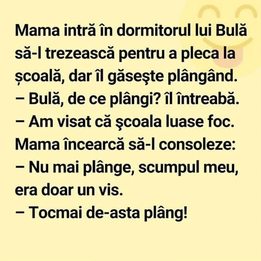 Ziua bună se cunoaște încă de dimineață, așa că trebuie începută cu zâmbetul pe buze. Iar pentru asta am pregătit un banc care cu siguranță o să te amuze copios. Protagonistul de astăzi este Bulă. Acesta are un vis ce îl face să izbucnească în lacrimi, iar deznodământul este hilar.