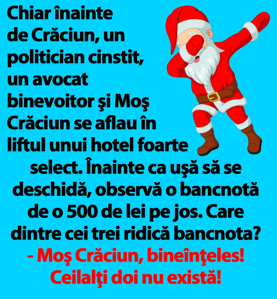 Chiar înainte de Crăciun, un politician cinstit, un avocat binevoitor și Moș Crăciun se aflau în liftul unui hotel foarte select. Înainte ca ușa să se deschidă, observă o bancnotă de 500 de lei pe jos. Care dintre cei trei ridică bancnota? -Moș Crăciun, bineînțeles! Ceilalți doi nu există!
