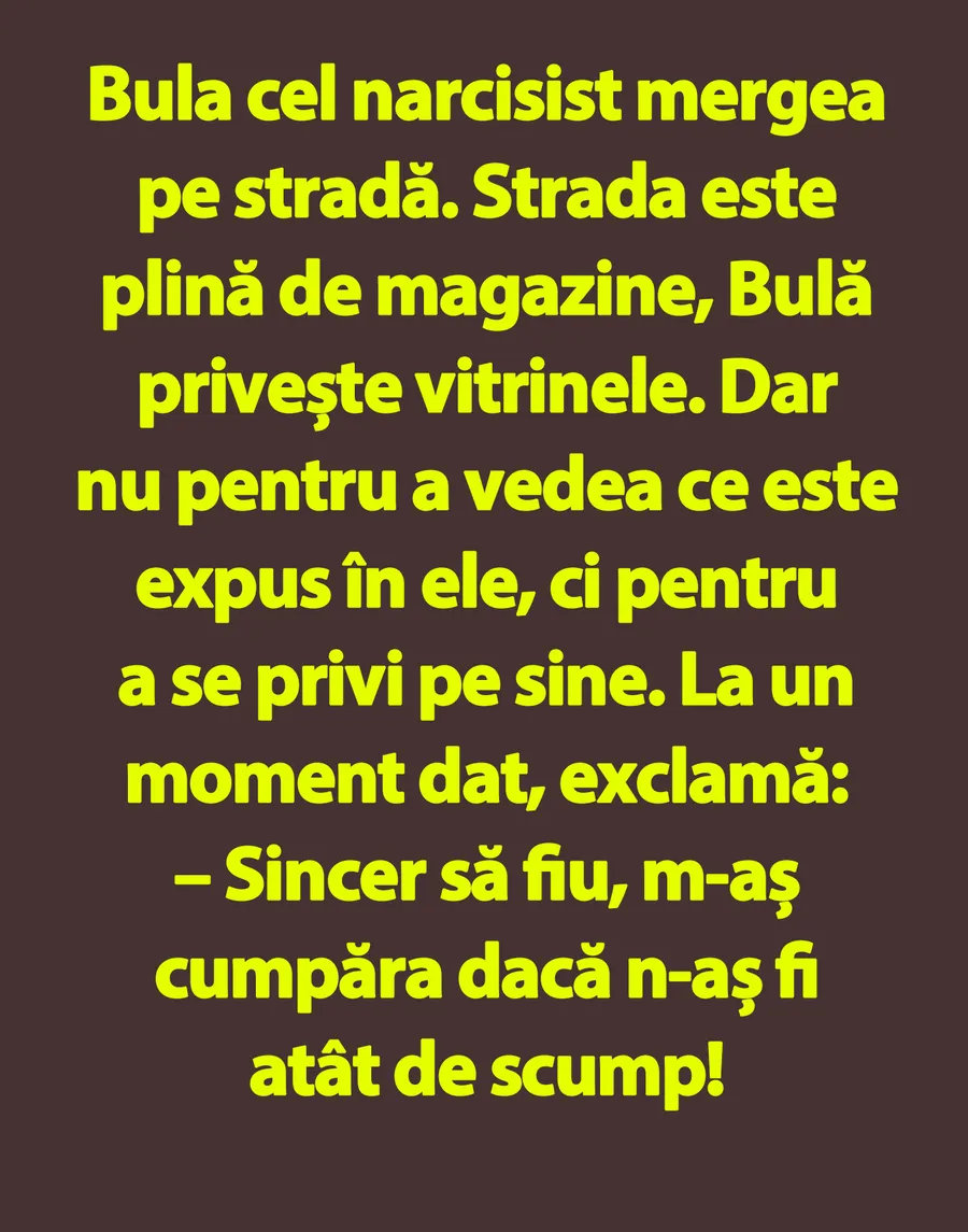 Bulă cel narcisist mergea pe stradă. Strada este plină de magazine, Bula privește vitrinele. Dar nu pentru a vedea ce este expus în ele, ci pentru a se privi pe sine. La un moment dat, exclamă: