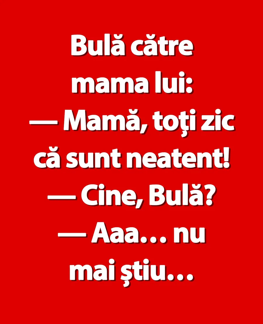 Dragi cititori, CANCAN.RO vă prezintă bancul zilei. Am pregătit o glumă savuroasă, menită să vă aducă zâmbetul pe buze. Fie că vă aflați acasă sau în oraș, luați-vă câteva momente și bucurați-vă de această glumă care îl are ca protagonist pe nimeni altul decât Bulă, personajul preferat al românilor. Spor la râsete și voie bună!
