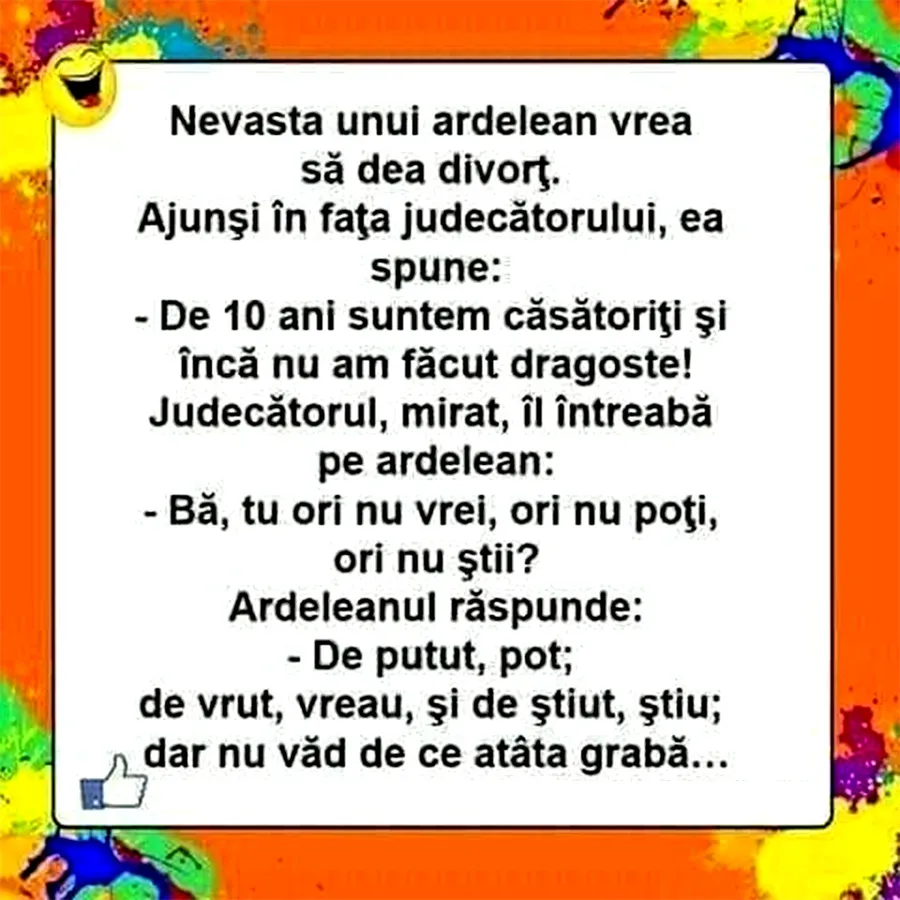 Nevasta unui ardelean vrea să dea divorț. Ajunși în fața judecătorului, ea spune: