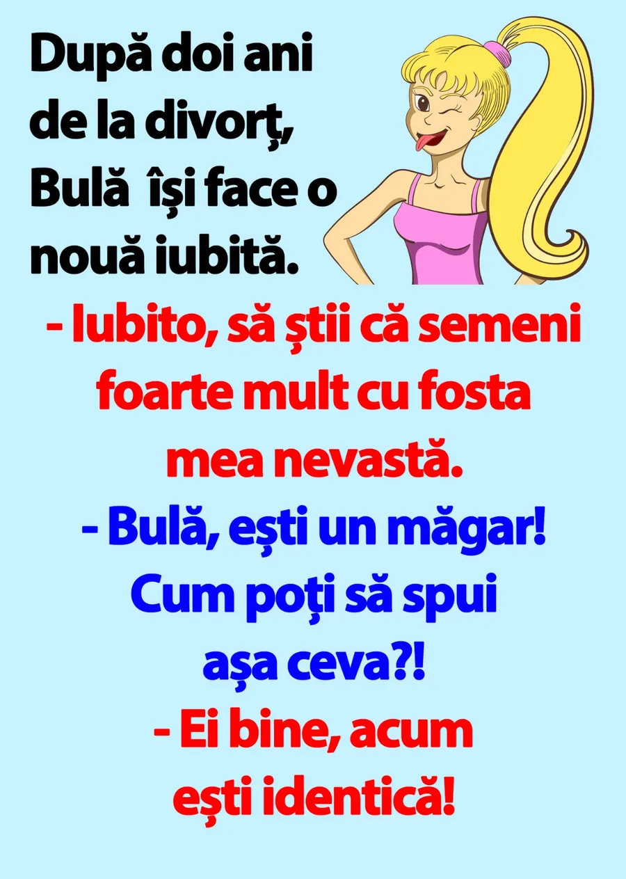 Banc. Pentru că este dimineață, ar fi ideal să vă începeți ziua cu zâmbetul pe buze. De data aceasta, bancul se învârte în jurul celebrului personaj Bulă. Își face o iubită, după doi ani de la divorț. Dialogul dintre Bulă și noua sa iubită stârnește amuzamentul. Spor la râs.