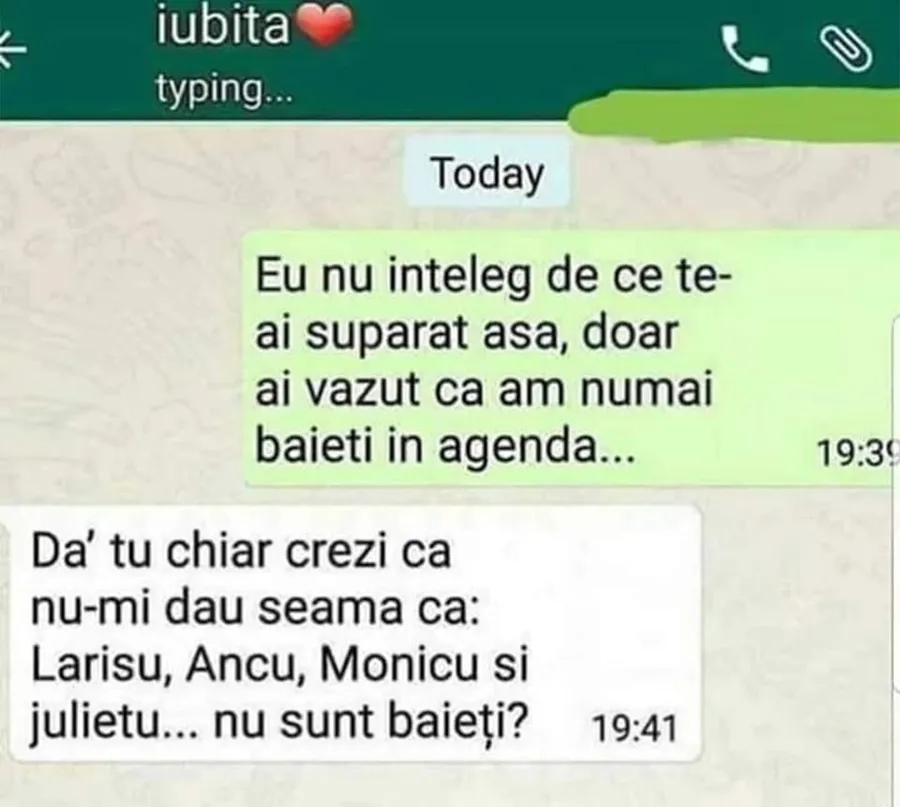 -Da, tu chiar crezi că nu-mi dau seama că: Larisu, Ancu, Monicu și Julietu… nu sunt băieți?”