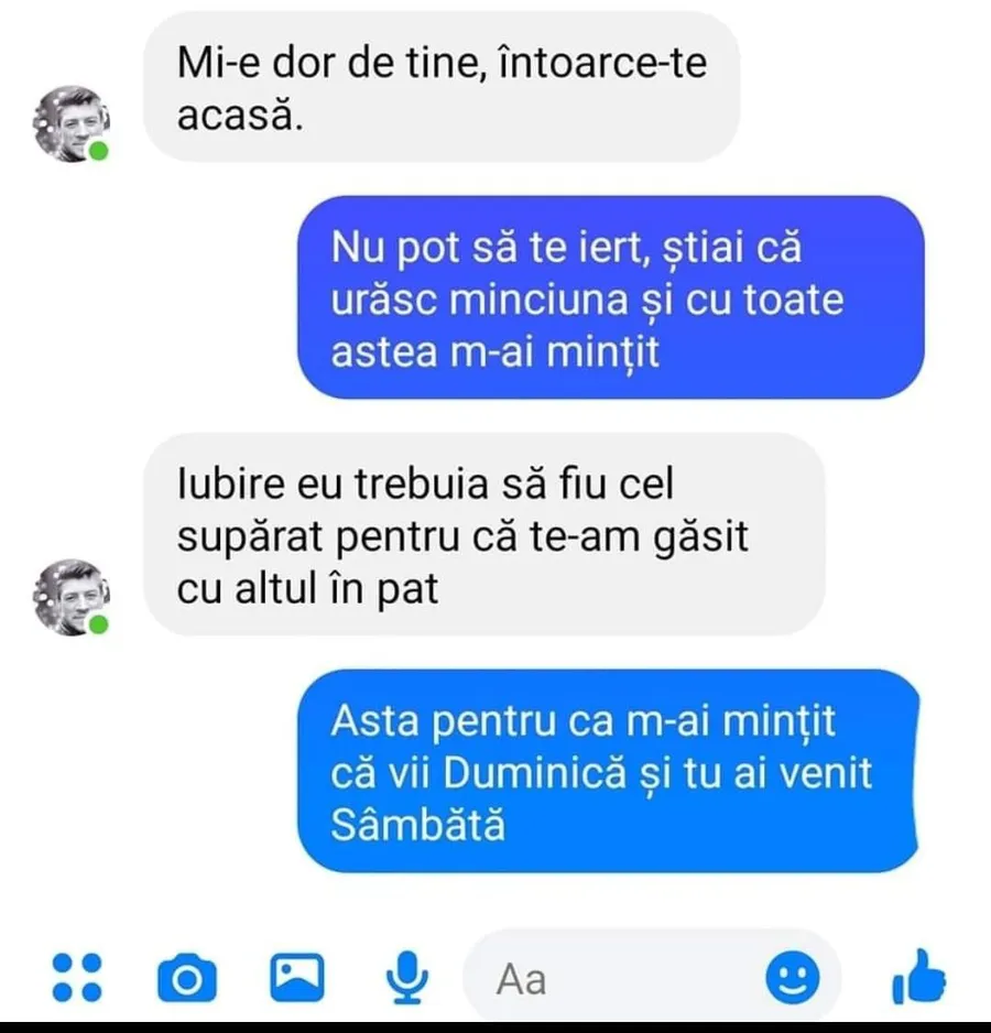 -Iubire, eu trebuie să fiu cel supărat pentru că te-am găsit cu altul în pat.