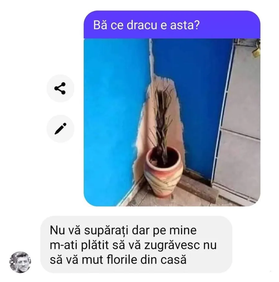 – Nu vă supărați, dar pe mine m-ați plătit să zugrăvesc, nu să vă mut florile din casă.