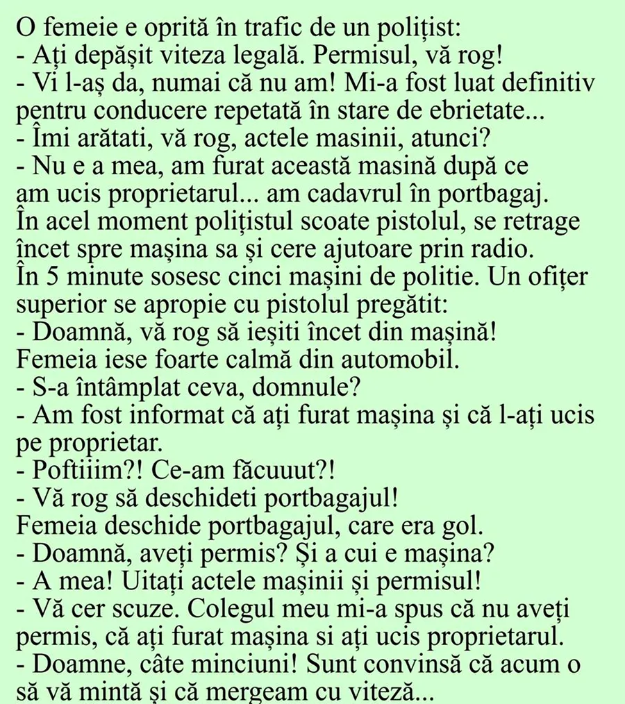 Ziua nu trebuie să treacă fără o porție copioasă de râs, iar pentru asta am pregătit un banc care cu siguranță o să îți aducă zâmbetul pe buze. Protagonista de astăzi este o doamnă ce este oprită în trafic pentru că a condus cu viteză. Aceasta găsește o metodă inedită de a scăpa de pedeapsă, iar deznodământul este hilar.