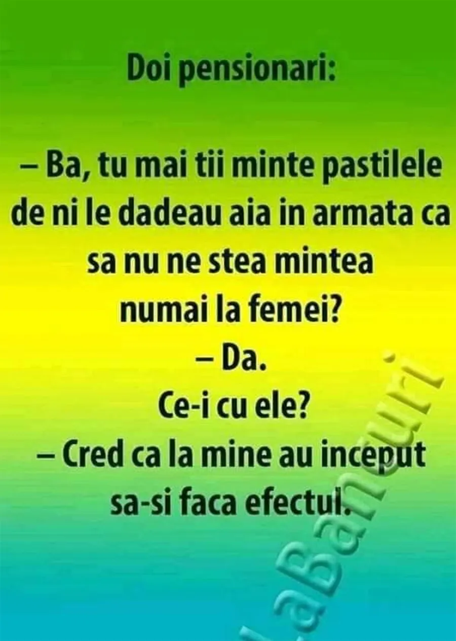 – Bă, tu mai ții minte pastilele de ni le dădeau în armată ca să nu ne stea mintea numai la femei?