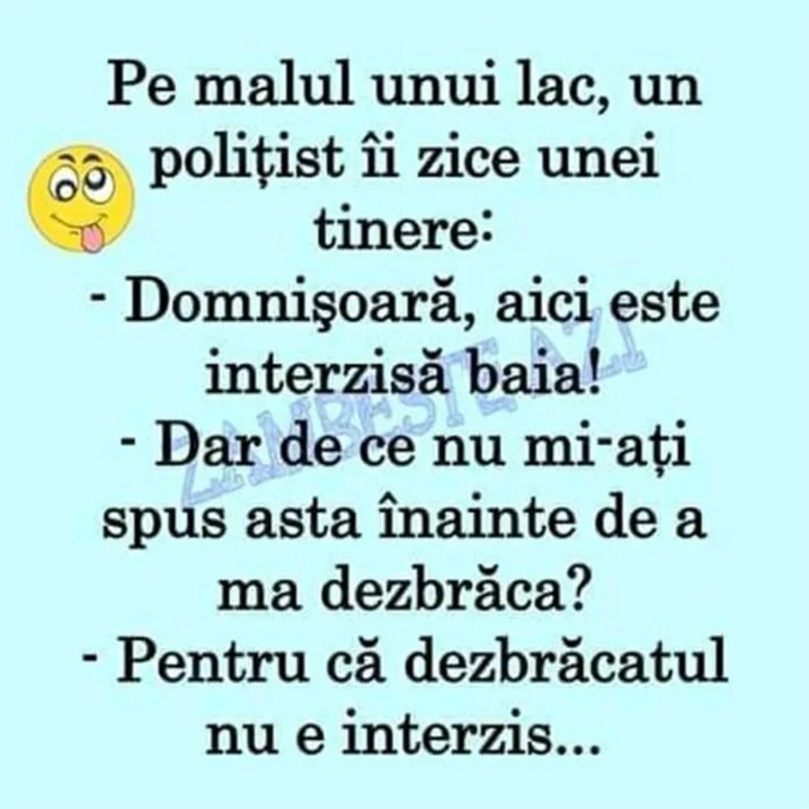 Pentru a încheia ziua corespunzător, CANCAN.RO ți-a pregătit încă o porție de râs, un banc de nota 10. Întâmplarea haioasă are loc pe malul unui lac. Conversația dintre un polițist și o femeie te va face să râzi cu lacrimi.