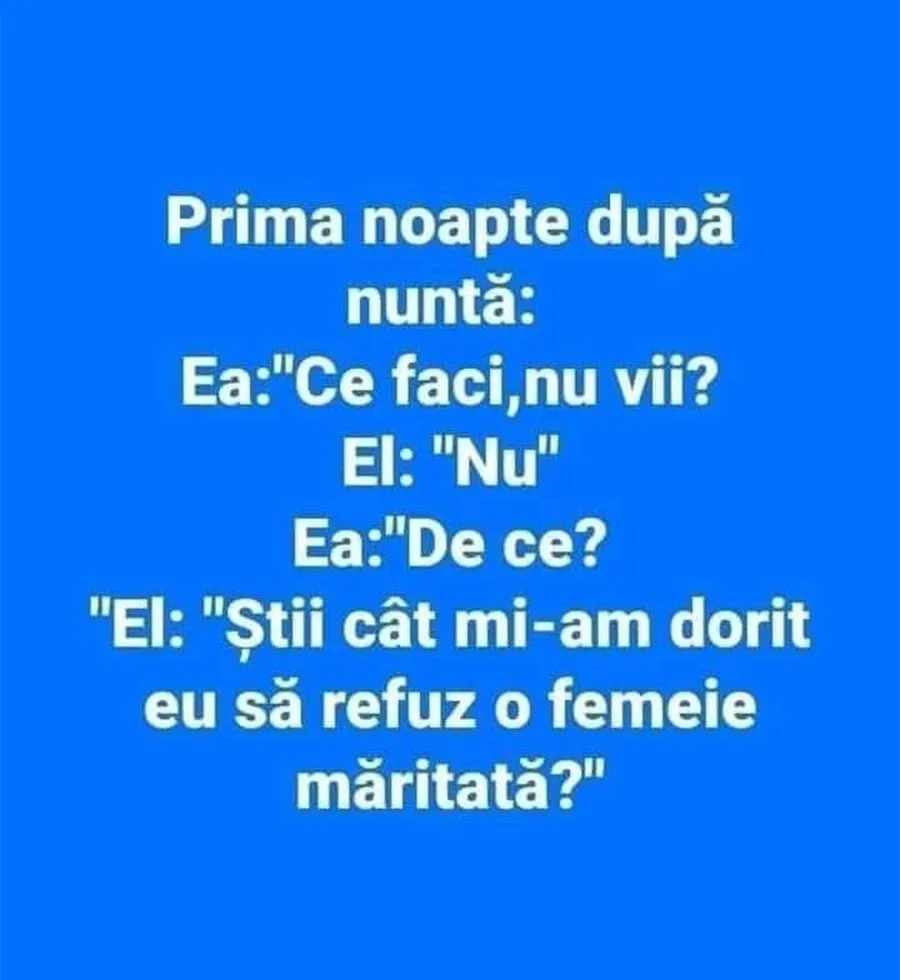 Dragi cititori, CANCAN.RO a pregătit un banc menit să vă aducă zâmbetul pe buze, în acest sfârșit de săptămână. Fie că sunteți acasă sau în oraș, luați-vă câteva momente și bucurați-vă de această glumă savuroasă. Este vorba despre un dialog între doi tineri căsătoriți. Spor la râsete și voie bună!