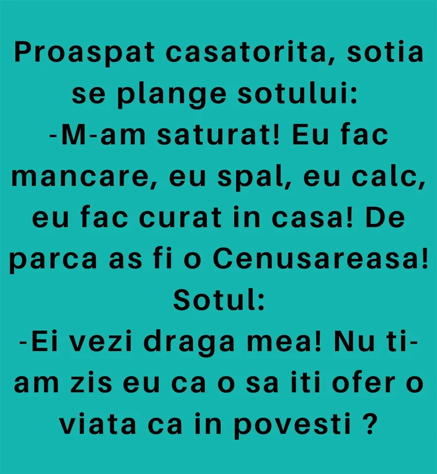 Dragă cititorule, CANCAN.RO ți-a pregătit un banc de nota 10. Discuția dintre doi tineri căsătoriți a devenit virală. Soția se plânge soțului că ea este singura care face mâncare, spală, calcă și face curățenie în casă. Răspunsul soțului te va face să râzi cu gura până la urechi. Spor și voie bună!