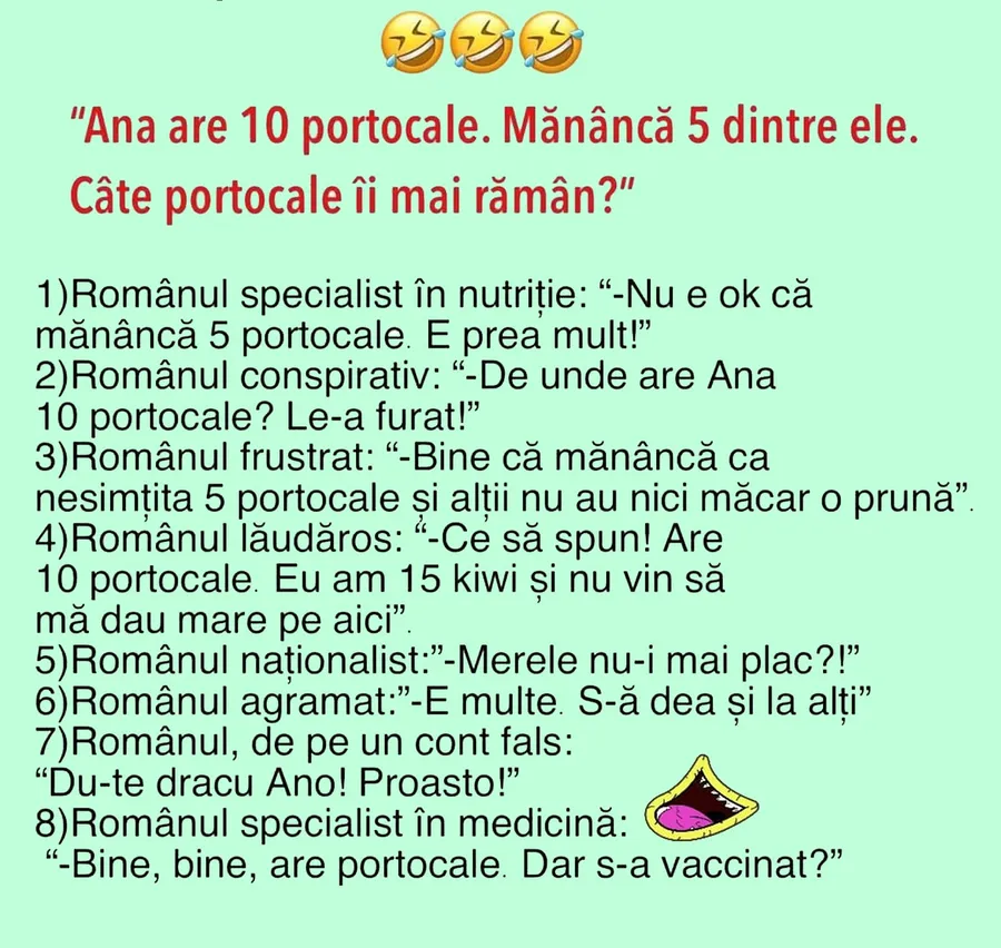 - Românul lăudăros: „Ce să spun! Are 10 portocale. Eu am 15 kiwi și nu vin să mă dau mare pe aici”