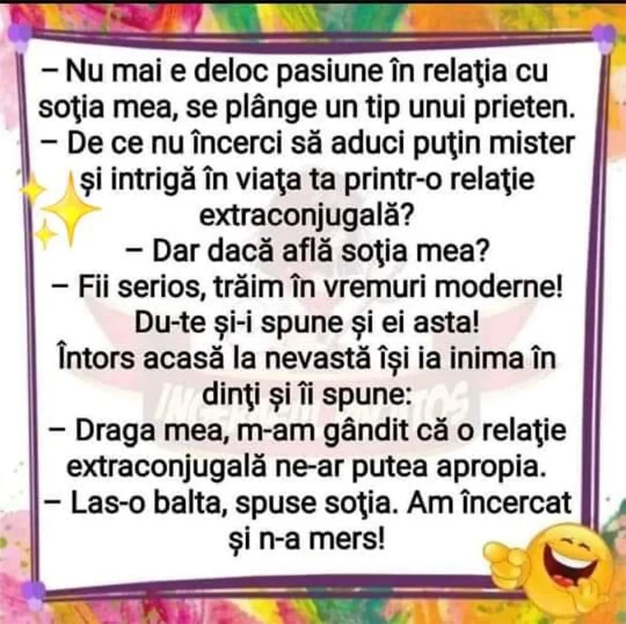 – Draga mea, m-am gândit că o relație extraconjugală ne-ar putea apropia.