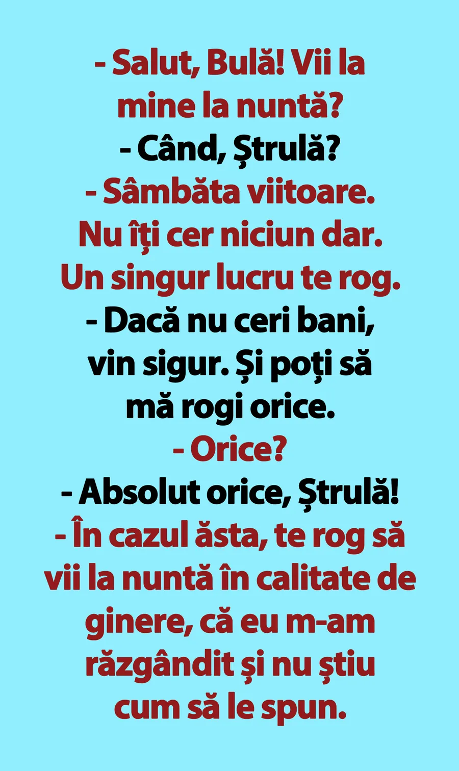 Dragă cititorule, CANCAN.RO ți-a pregătit un banc de nota 10 încă de la prima oră a zilei! Vrem să ne asigurăm că începi ziua cu zâmbetul pe buze, așa că avem pentru tine un banc cu Bulă. Evident, Ștrulă ia și el parte la acțiunea glumei, fiind cel care vrea neapărat să îl aibă pe celebrul Bulă la nunta sa. Dar nu vă mai ținem pe jar și vă prezentăm bancul de azi: