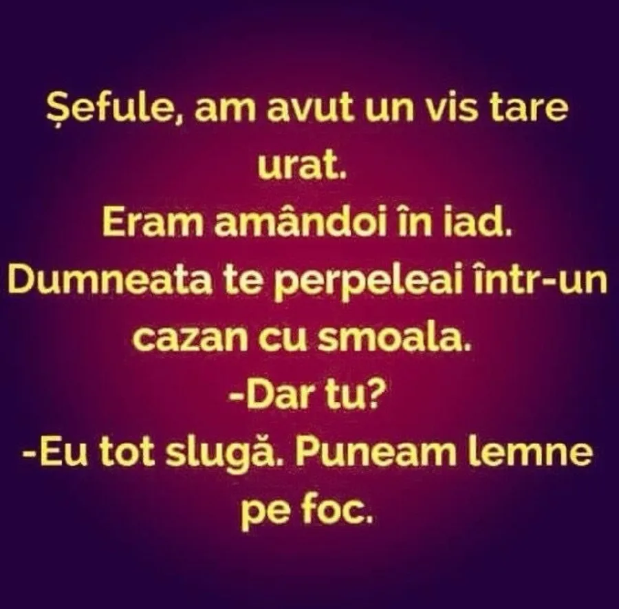 „ – Șefule, am avut un vis tare urât. Eram amândoi în iad. Dumneata te perpeleai într-un cazan cu smoală.
