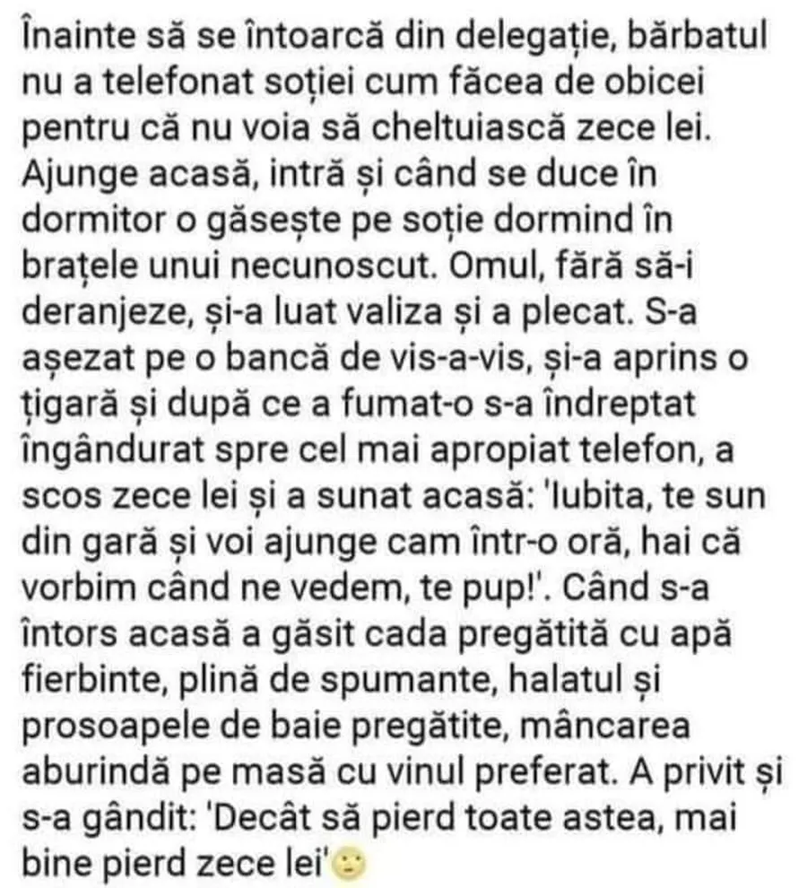Înainte să se întoarcă din delegație, bărbatul nu a telefonat șotiei cum făcea de obicei pentru că nu voia să cheltuiască zece lei.