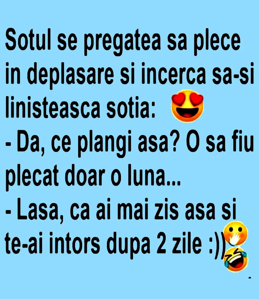 Dragă cititorule, CANCAN.RO ți-a pregătit un banc de nota 10. Soțul se pregătește să plece în deplasare și încearcă să-și liniștească soția. Spor la râs și voie bună!