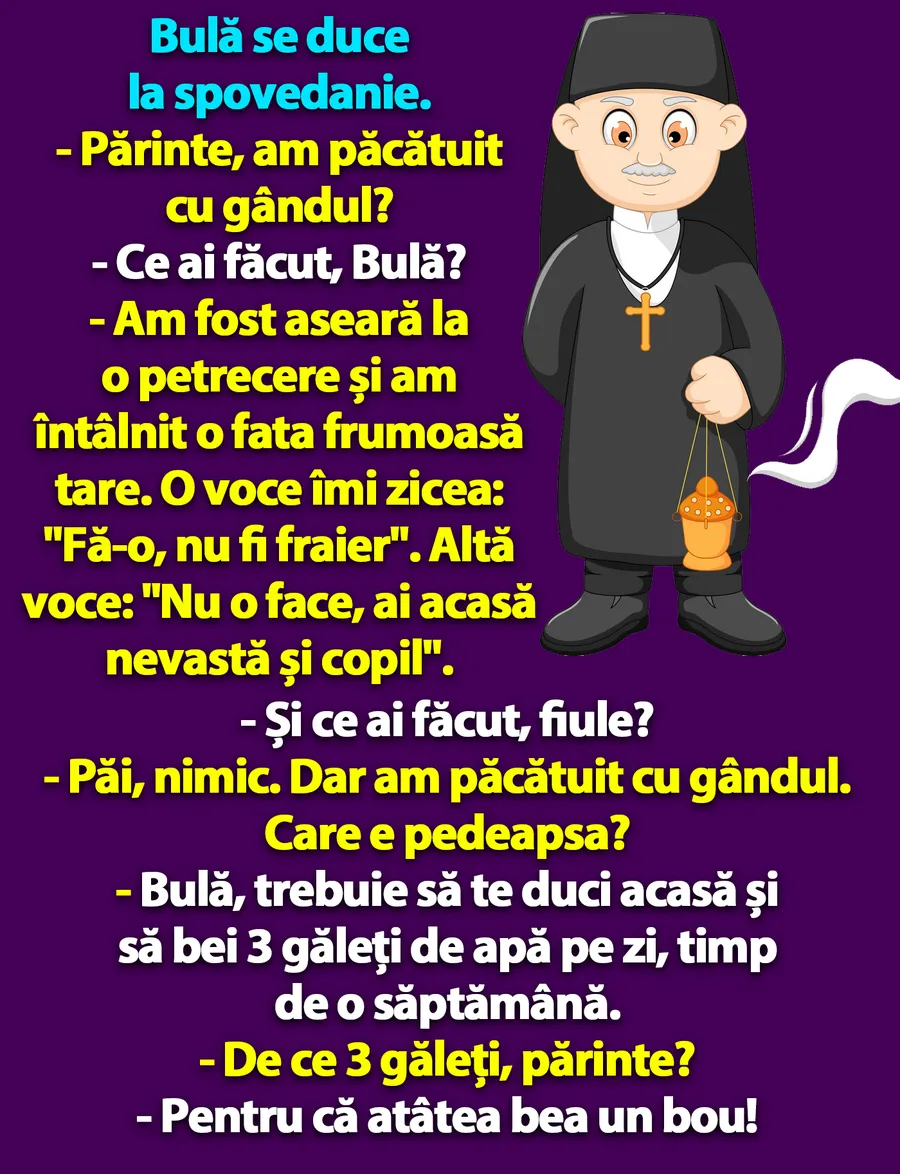 Dragă cititorule, CANCAN.RO ți-a pregătit un banc de nota 10. Bulă se duce la spovedit și îi spune preotului că a păcătuit cu gândul. Ești pregătiti să râzi cum nu ai mai făcut-o de mult timp? Spor și voie bună!
