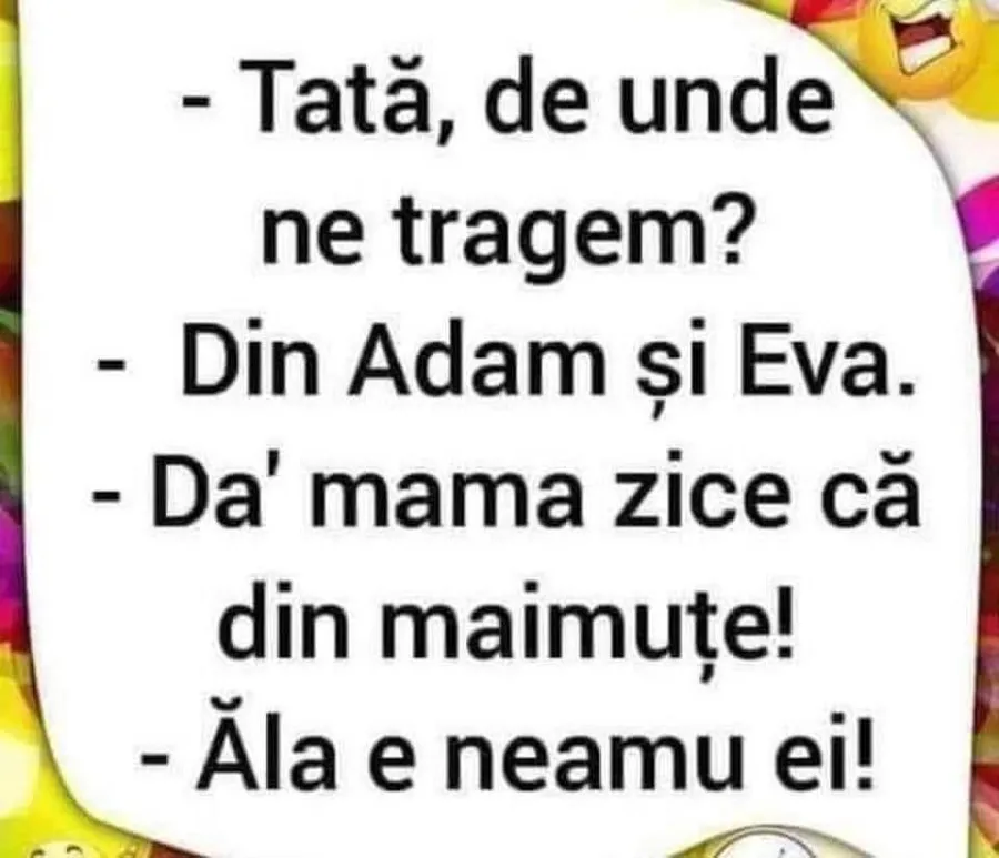 Nu trebuie să treacă nicio zi fără o porție copioasă de râs, iar pentru asta am pregătit un banc care cu siguranță îți va aduce zâmbetul pe buze. Protagoniștii de astăzi sunt tată și fiu. Cei doi discută despre originile lor, iar deznodământul este hilar.