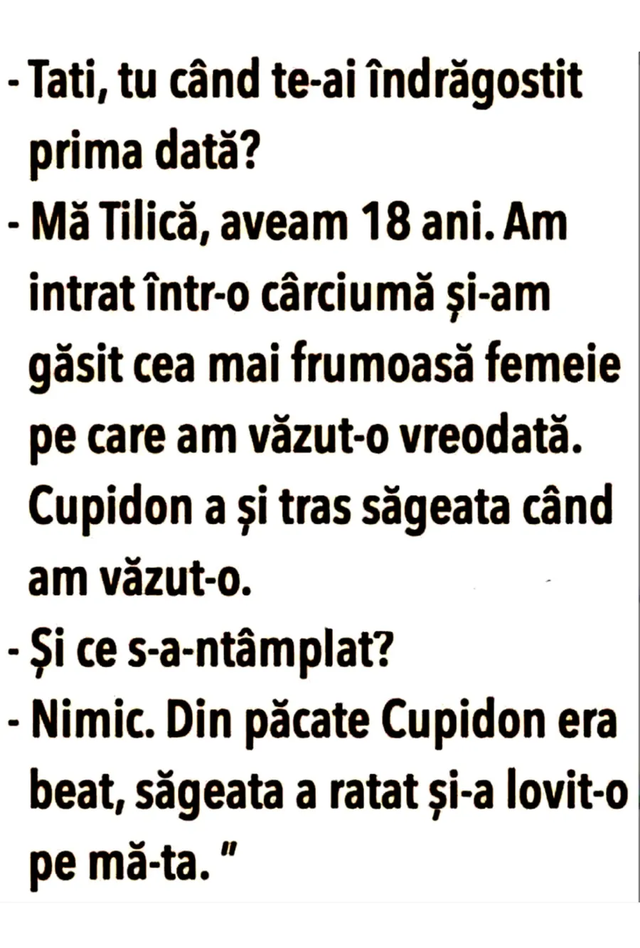 – Nimic. Din păcate Cupidon era beat, săgeata a ratat și a lovit-o pe mă-ta.