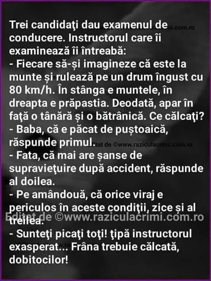 Nu trebuie să treacă nicio zi fără o porție copioasă de râs, iar pentru asta am pregătit un banc care cu siguranță o să te amuze copios. Protagoniștii de astăzi sunt trei candidați care dau examenul de conducere. Deznodământul este hilar.