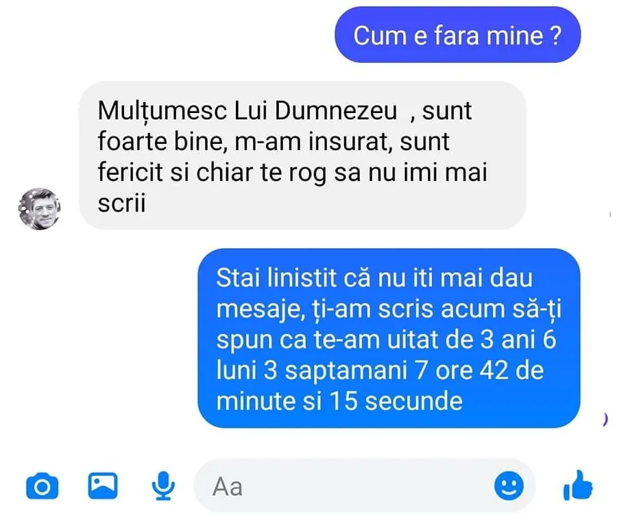 – Stai liniștit că nu îți mai dau mesaje. Ți-am scris acum să-ți spun că te-am uitat de 3 ani 6 luni 3 săptămâni 7 ore 42 de minute și 15 secunde.