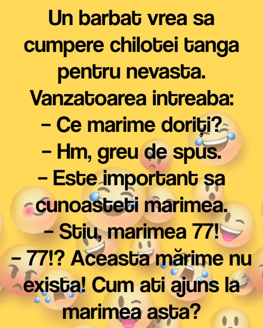 Banc. Un bărbat merge hotărât, într-un magazin, pentru a cumpăra chiloței tanga pentru soția lui. Acolo, însă, este întrebat de mărimea pe care o poartă partenera. Din acel punct, dialogul stârnește amuzament! Spor la râs, dragi cititori!