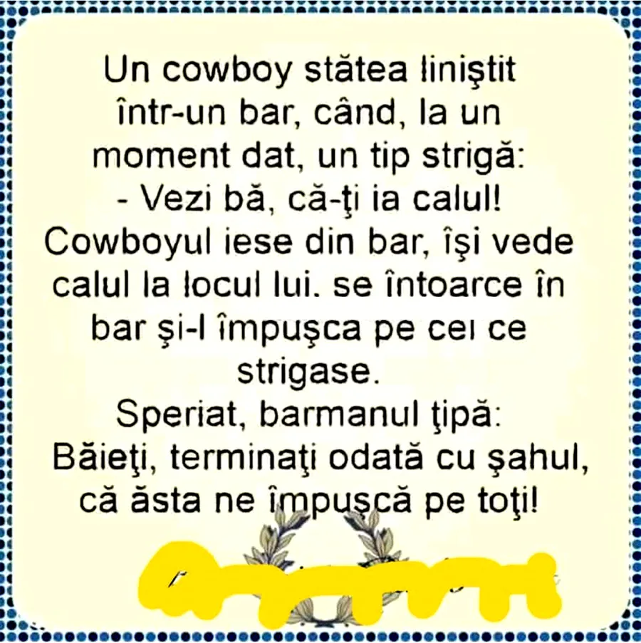 Un cowboy stătea liniștit într-un bar, când, la un moment dat, un tip strigă:
