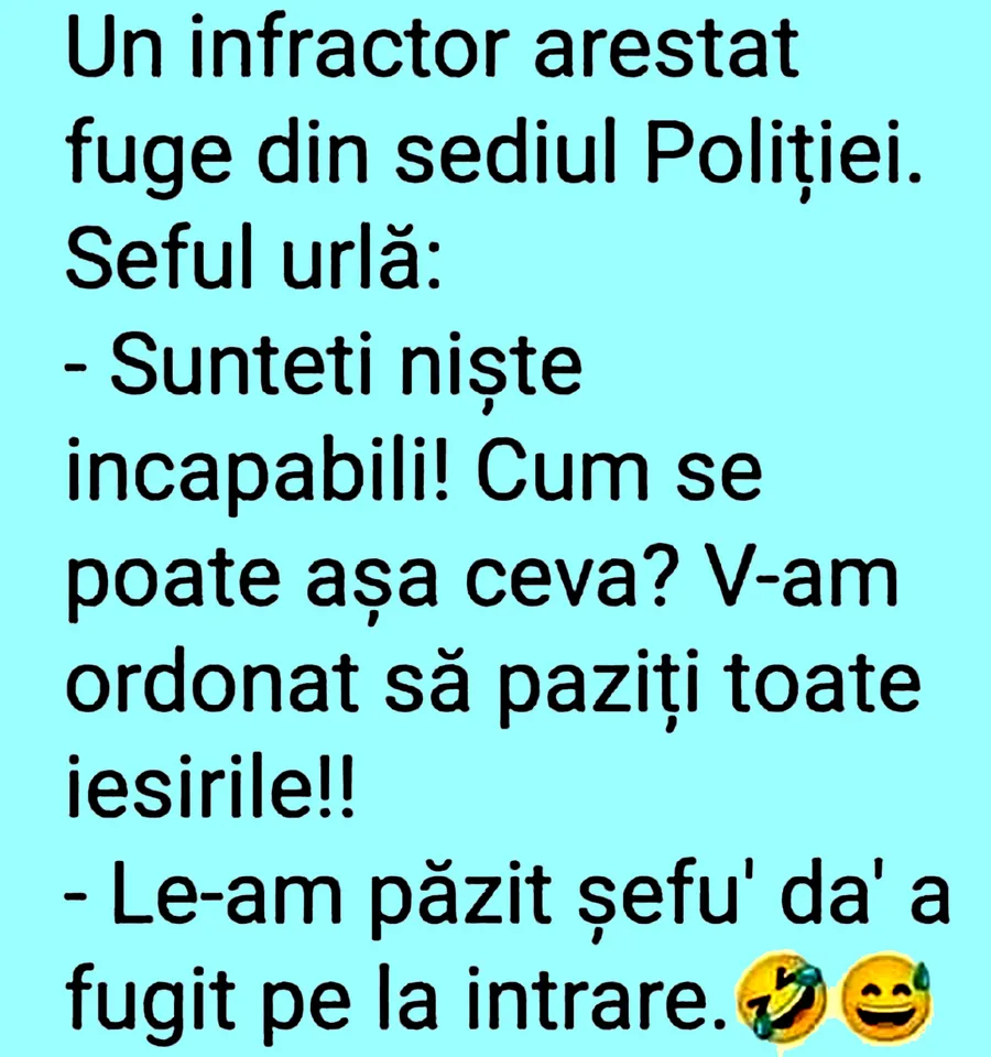 La fel ca în fiecare zi, CANCAN.RO ți-a pregătit un banc de nota 10. Vezi în ce situație ajunge un infractor arestat care reușește să fugă din sediul Poliției.